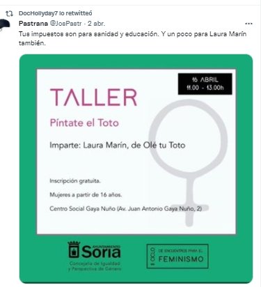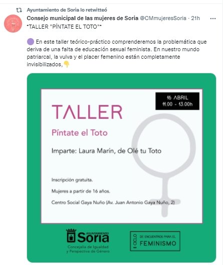 Cuando creíamos que no se podía innovar más en los talleres de igualdad, llega 'Píntate el toto'. Se lo explicamos: lo organiza la concejalía de Igualdad y Perspectiva de Género del Ayuntamiento de Soria, liderado por el PSOE, y consiste en «revertir» una situación en la que «la vulva y el placer femenino están completamente invisibilizados» con una propuesta que reflexione sobre ello «de forma creativa». ¿Cómo? Organizando un debate en el que compartir «experiencias, creencias y aprendizajes» para después dibujar vulvas en 'tote bags' (bolsas de tela) y «sacar el tema a la calle de paseo».