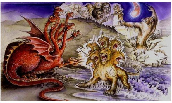 Pero tanto Castellani como todos los demás intérpretes de las postrimerías, siempre hablan, con las más diversas variantes, de la Bestia el Mar y la Bestia de la Tierra y parecen empeñados en distinguir entre ambas. Mucho me temo que voy a incurrir en simplificación pero digamos que la primera bestia es política y la segunda religiosa. Si lo quieren en formato caricatura, la primera sería el Anticristo y la segunda el Antipapa. Sí, una simplificación probablemente falsa pero nos sirve para entendernos.
