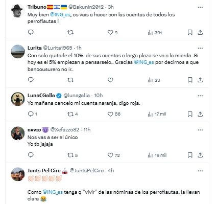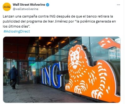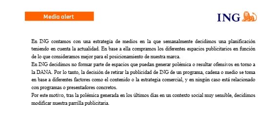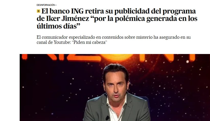 Entre los primeros en retirar su publicidad, el banco ING. Bajo el ladillo 'Desinformación' (esto no es baladí, porque señala a los periodistas o medios que no aceptan el dictado del Gobierno), El País titula: "El banco ING retira su publicidad del programa de Iker Jiménez “por la polémica generada en los últimos días"".