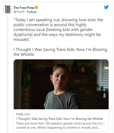 En un artículo publicado el 9 de febrero en The Free Press, Jamie Reed, de 42 años, que se identifica como «mujer queer» y progresista política, afirma que en noviembre dejó su trabajo como gestora de casos en el Centro de Transexuales de la Universidad de Washington, en el Hospital Infantil de San Luis, porque ya no podía seguir apoyando lo que el centro estaba haciendo a los menores con confusión de género.