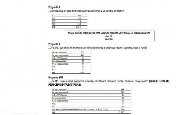 La consulta, realizada por teléfono a 2.357 españoles en 731 municipios de 50 provincias españolas, refleja que el 8,2 por ciento de la población no cree que en este momento se esté asistiendo al cambio climático, mientras que el 2,4 por ciento no sabe.