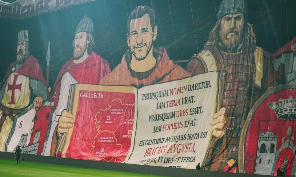 La policía intervino antes de un partido de fútbol en Braga, Portugal, para retirar esta pancarta, que evocaba el orgullo de la ciudad y sus profundas raíces cristianas, por "no estar relacionada con el deporte".