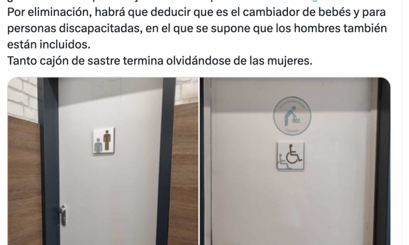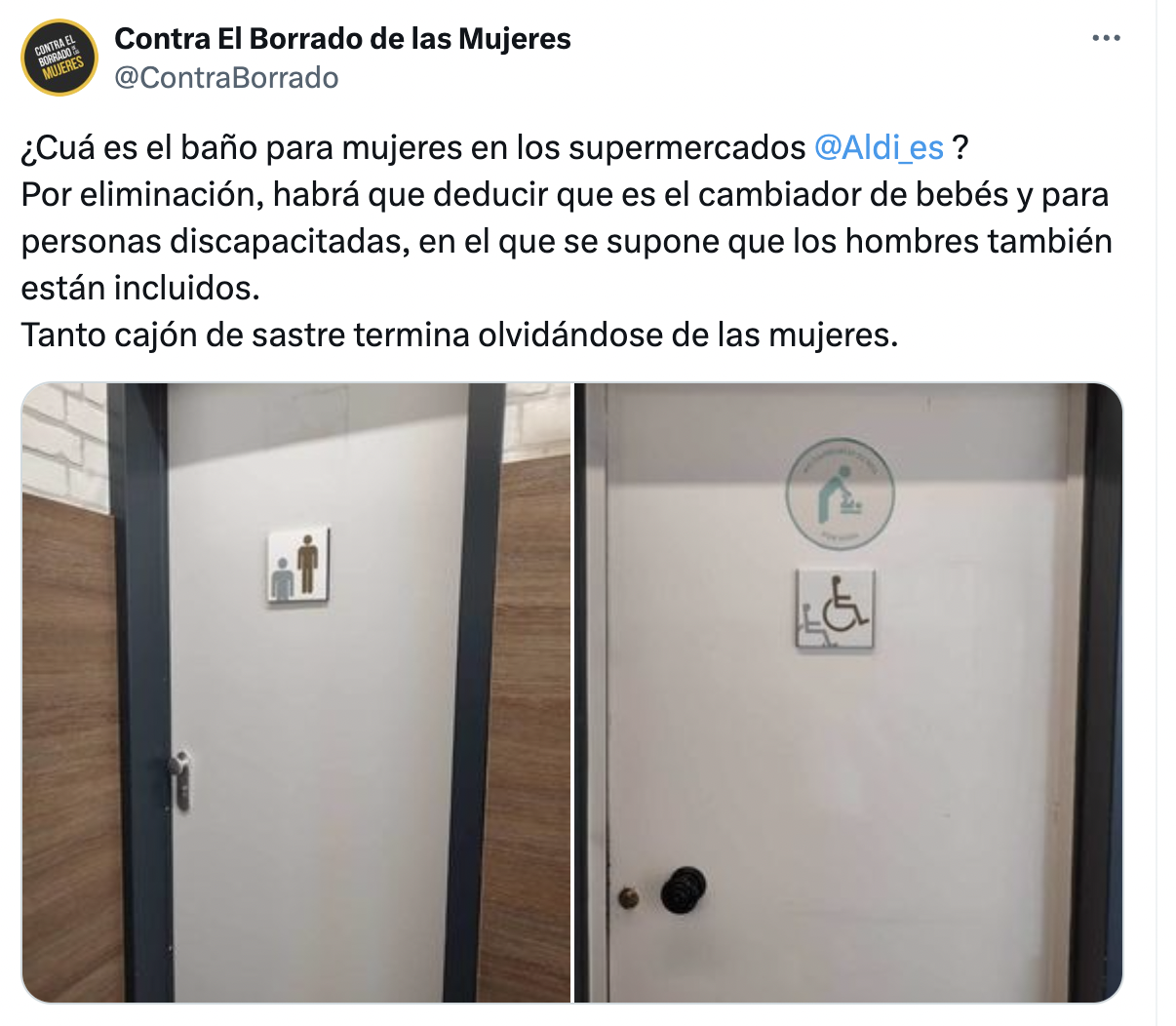 La denuncia parte de la Alianza Contra el Borrado de las Mujeres, con tanta inclusión, tanto negar los géneros y tantos los, las y les, al final las mayores perjudicadas son las mujeres. Eso ha pasado con los baños de los supermercados Aldi, que obvian por completo al sexo femenino, dividiendo sus aseos en hombres y cambiador de bebe y minusválidos, donde también pueden entrar hombres.