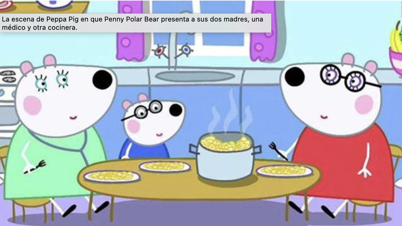 Pues bien: la última serie en respaldar la "corrupción de menores” —como denomina a estas prácticas el líder de Vox, Santiago Abascal—, ha sido nada menos que la popular Peppa Pig. En un episodio titulado ‘Familias’, que se estrenó recientemente, la protagonista, la cerdita Peppa Pig, conoce a las dos madres de su amiga Penny Polar Bear. Mientras hace un dibujo de su familia, Penny le explica: “Vivo con mi mamá y mi otra mamá. Una mamá es doctora y la otra cocina espaguetis”, tal y como recoge Religión en Libertad.