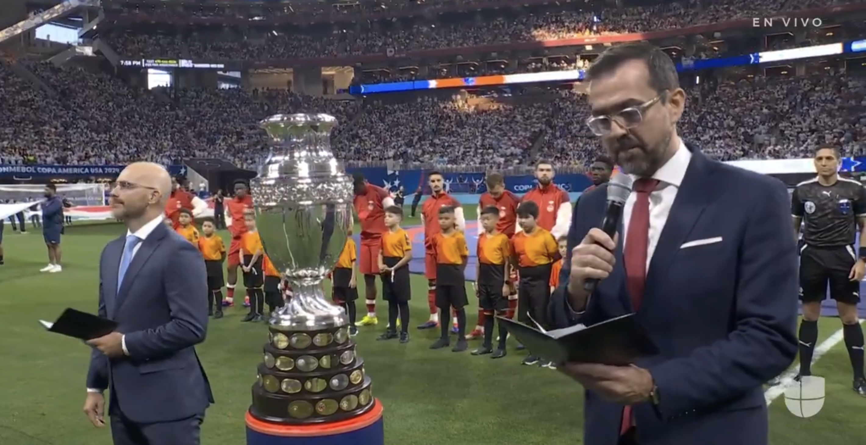 Bien, a continuación tienen un vídeo de la inauguración de la Copa América en la cancha del Mercedes-Benz Stadium, en los discurso de bienvenida antes del partido de Argentina y Canadá, tomó la palabra Emilio Agüero Esgaib, quien en la red social X se describe como columnista y predicador religioso. Agüero leyó un discurso religioso, con referencias al cristianismo, religión mayoritaria en Estados Unidos.