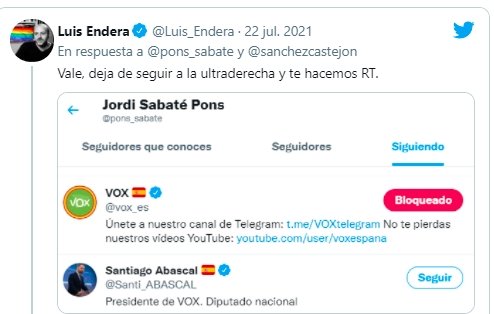 Endera añadió a su respuesta a Sabaté que le haría un retuit, es decir que difundiría su campaña, cuando dejase de seguir a gente de ultraderecha. Es decir, pensamiento progre: te ayudaré si piensas como yo, si no, no te ayudo y además te insulto.