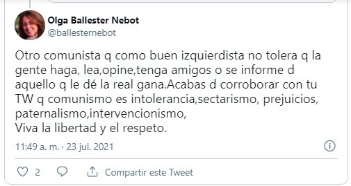 Según Periodista Digital tras publicar su respuesta, decidió bloquear a prácticamente todas las cuentas que siguen a Sabaté Pons para que nadie pudiese ver la misma. Pero fue lo suficientemente rápido.