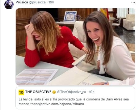 Dice la exministra Ione Belarra que "Gracias a la lucha del moviendo feminista y a quienes han luchado por la Ley Solo Sí es Sí hoy podemos tener sentencias como las de Dani Alves. Enhorabuena a todas ellas".