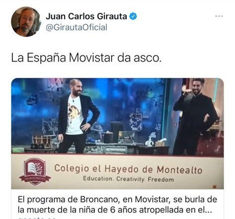Estamos dispuestos a aceptar que en un monumental despiste del equipo de postproducción del señor Broncano se emitió el programa tal y como estaba previsto. Resulta mucho más difícil de aceptar que al día siguiente se siguiera promocionando el mismo. Seguramente Broncano no se quería burlar de Mariquilla, la niña de 5 años fallecida, pero consciente o inconscientemente utilizó el impacto social como gancho de su 'divertidísimo' sketch. Y si no lo utilizó, así lo creyeron cientos de personas en las redes sociales que dirigieron sus dardos contra el presidente de Telefónica, José María Álvarez-Pallete, diciéndole de todo, menos bonito.