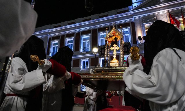 Cada uno que saque sus propias conclusiones. Viernes Santo, Puerta del Sol de Madrid, encuentro de hermandades en torno al Lignum Crucis. Las cinco estaciones de penitencia del Viernes Santo: Divino Cautivo, seguida de Siete Dolores, Cristo de los Albarderos, Santo Entierro (Cristo Yacente) y Virgen de la Paz, participaron.