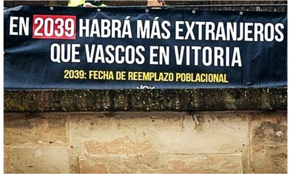 Vox ha lanzado en Vitoria una campaña para denunciar la inmigración masiva y el reemplazo poblacional. Así, ha colocado distintas pancartas en las que se puede leer «En 2039 habrá más extranjeros que vascos».