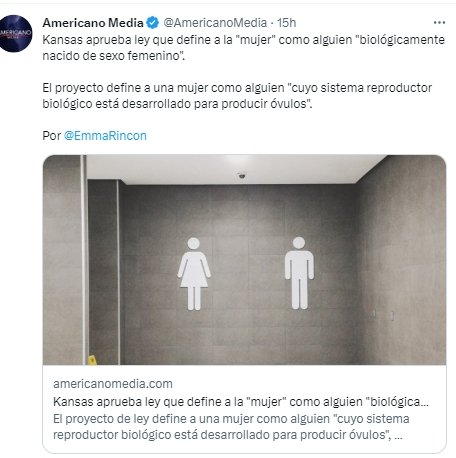 Kansas ha aprobado una ley que define a la "mujer" como alguien "biológicamente nacido de sexo femenino". Define a una mujer como alguien "cuyo sistema reproductor biológico está desarrollado para producir óvulos", mientras que "hombre" se refiere a cualquiera cuyo sistema reproductor "está desarrollado para fertilizar los óvulos de una mujer". Así lo han dejado claro los legisladores en la Declaración de Derechos de la Mujer, con el objetivo de defender y preservar los espacios para personas de un solo sexo, por ejemplo baños públicos, y para salvaguardar el deporte femenino.