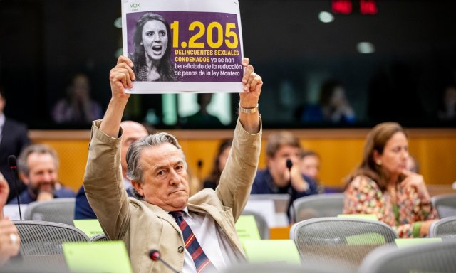 Parlamento Europeo: interviene Irene Montero durante la Comisión de Derechos de la Mujer e Igualdad de Género. Entonces, el periodista y eurodiputado de Vox Herman Terstch, levanta un cartel con la leyenda: "1.205 delincuentes sexuales condenados ya se han beneficiado de la reducción de penas de la ley Montero". "¡Han sido liberados por ella!", ha dicho Terstch, con los papeles en la mano y acercándose al atril.