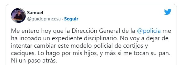 A través de su Twitter, Vázquez compartía: «Me entero hoy que la Dirección General de la @policia me ha incoado un expediente disciplinario. No voy a dejar de intentar cambiar este modelo policial de cortijos y caciques. Lo hago por mis hijos, y más si me tocan su pan. Ni un paso atrás».