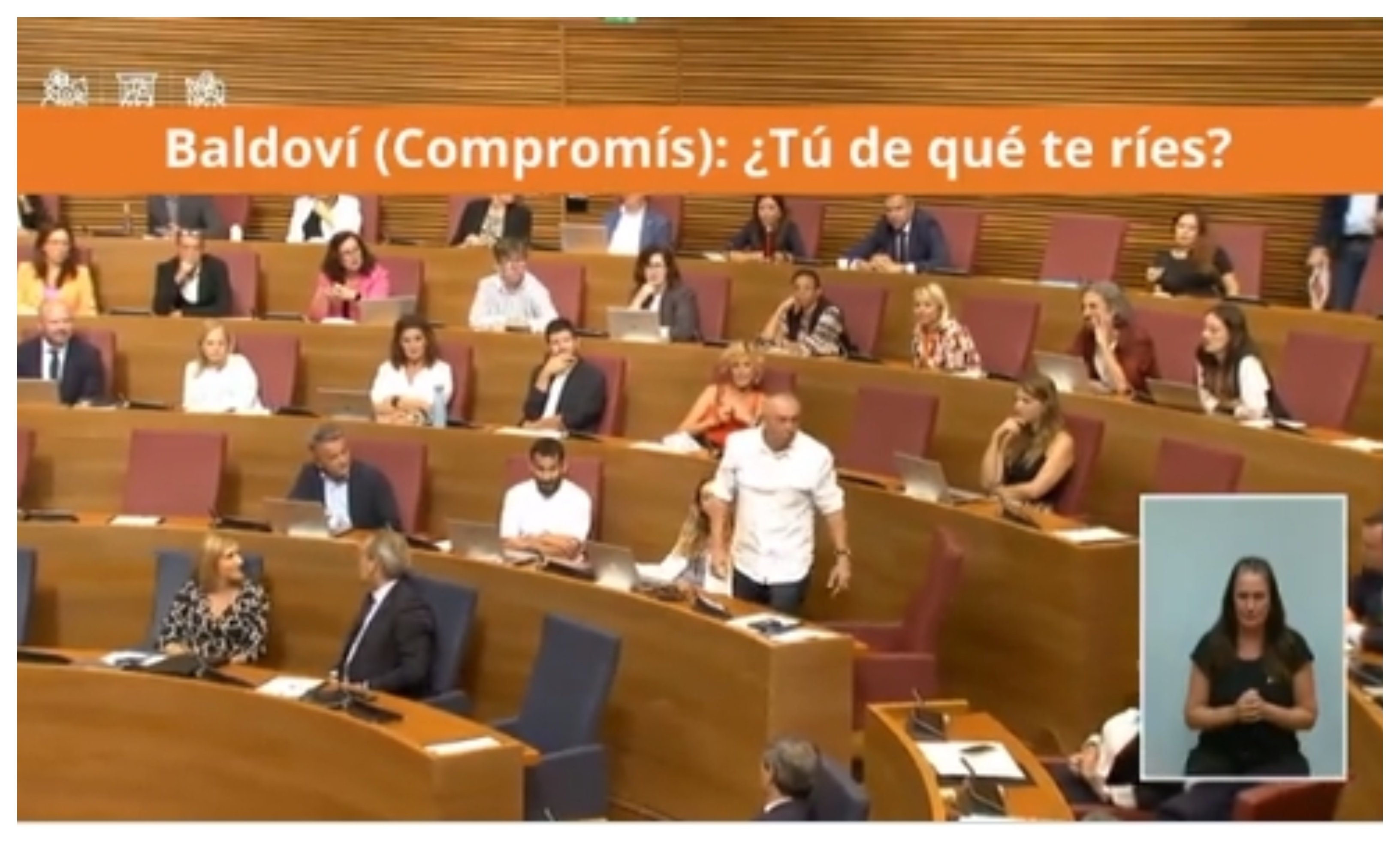 Joan Baldoví, diputado de Compromis, se dirige así, amenazante y en valenciano -allí todavía no han llegado los pinganillos del Congreso- a una diputada de Vox en las Cortes Valencianas.