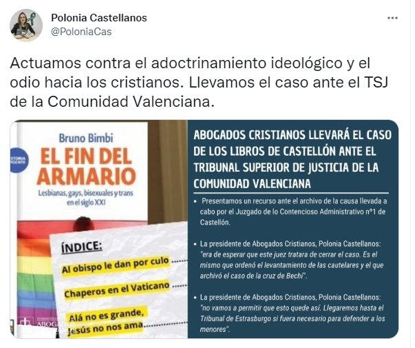 En un tuit, la presidenta de la asociación Abogados Cristianos, Polonia Castellanos, mostró algunos de los contenidos de esos libros que se enseñan en los institutos públicos de Castellón. Pasen y lean: