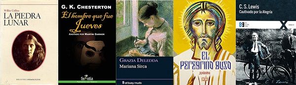 Cautivado por la Alegría (Encuentro). C. S. Lewis cuenta su conversión del ateísmo al cristianismo. Una historia con una carga autobiográfica en la que su capacidad creativa no deja indiferente a nadie, porque si bien la historia es importante para comprender a este ensayista del sigo XX, la manera de exponerla y su capacidad descriptiva es completamente maestra y me atrevo a recomendar a muchos autores modernos a darse un repasito por estas páginas y aprender lo que es la narrativa minimalista y claramente suficiente. En todo caso se trata de una historia "insoportablemente personal" como dijo en cierta ocasión el propio Lewis. El peregrino ruso (Bendita María) de Anónimo. Si quieres una historia algo subida y en tono espiritual, esta es la novela que debes leer. Se trata del peregrinaje de un personaje por tierras rusas, donde se cruza con caminantes y experiencias diferentes que le hacen ver la gran gloria de la vida y lo cerca que todo está de Dios creador. Una narración que engancha al lector porque, como en casi todas estas narraciones, surgen del interior de la persona donde todos somos tan parecidos. Es consolador ver que hace décadas, en otros mundos y otras culturas, las pasiones y las debilidades humanas son tan coincidentes. Mariana Sirca (Buey Mudo). Grazia Deledda fue Premio Nobel de Literatura en 1926... Posiblemente la autora más dulce, contando con sencillez lo enrevesado de la vida. Mariana Sirca es una historia de amor de bandoleros, de libertad y de costumbres arcaicas que someten al individuo en las zonas sardas. Una historia que muestra el buen estilo romántico y trágico sin necesidad de caer en lo erotizante de los tiempos que vivimos, donde si no se acude como "argumento de peso" a lacerantes escenas de sexo, no eres nada... ¡Bueno sí, un estrecho católico represor! En fin... Ahora en serio, si desea volver al buen gusto y a la tensión literaria, no deje de apuntarse esta obra para leer, no en vano tras las páginas de esta obra hay una Premio Nobel. La piedra lunar (Homolegens) de Wilkie Collins. El propio autor dijo de esta novela que: "Mi meta ha sido señalar aquí la influencia ejercida por el carácter sobre las circunstancias". Intriga y pasión mucho antes de que llegara a nuestras estanterías el afamado Sherlock Holmes. Collins facturó esta novela de tintes orientales con el glamour británico de la época victoriana. Muy entretenida y es una demostración de novelas de éxito de hace muchos años que no admiten el paso del tiempo. El hombre que fue Jueves (Sekotia) de G.K. Chesterton. Si hay un clásico reconocido por todos es precisamente Chesterton y de sus obras novelescas -¡y no digamos de los ensayos!- quizá sea esta la que más se ha leído, versionado y "peliculado". El argumento es sencillo: poli bueno se introduce en una banda de supuestos pretendientes a dominadores del mundo. Sin embargo, es en los diálogos y los razonamientos del narrador donde está la miga de la historia, porque Chesterton, ya lo saben, no daba puntada sin hilo. Pero esta versión de Sekotia aporta una novedad que la hace diferente, y posiblemente insuperable por esto mismo, que está anotada por el gran Martin Gardner, el maestro matemático y biógrafo del autor, que con gran habilidad aporta significados o explicaciones a la obra para que el lector le saque hasta la última gota. Si quiere aprovechar el libro, esta es su ocasión, no la pierda... Humberto Pérez-Tomé Román @hptr2013