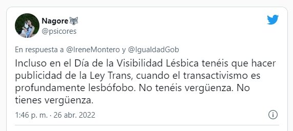 La felicitación se le ha vuelto en contra a la ministra que ha recibido numerosas críticas de esa parte del feminismo que cree que la legislación que está preparando pretende borrar a las mujeres. De hecho, tal como recoge El Español, "Irene Montero, dimisión" ha sido una de las consignas más repetidas en Twitter.