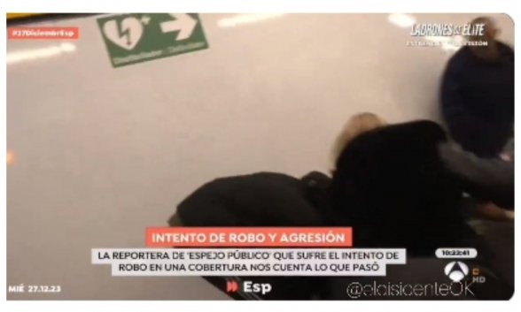 Hecho real y en directo. Una reportera de 'Espejo Público' de Antena 3 sufre un intento de robo y agresión mientras hace un directo con el programa. La periodista descubre a un hombre intentando robar en la 'mochila de los directos' del programa y se lo impide. Tras informarle de que está siendo grabada, el individuo, cuyo rostro es ocultado en las imágenes, amenaza a la chica y se va por donde ha llegado.