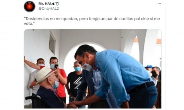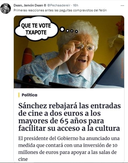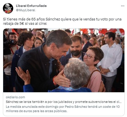 Sánchez regalando cine a 2€ para jubilados!!! #QueTeVoteTxapote #SanchezTraidor 🤬#VotaLoQuePiensas 😂😂#eurovision pic.twitter.com/Pr4vO4WsFo