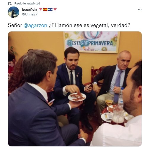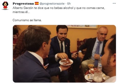 Sociedad Memes. Garzón, jamón La izquierda exquisita: es ibérico, que conste. Redacción 06/05/22 12:23 Garzón: es jamón, no carne Etiquetas: Memes Opinión Enormes minucias por Eulogio López ¿El acuerdo de pesca de Luis Planas es bueno? Sí, lo es, pero no va al fondo de la cuestión Eulogio López Elma Saiz en Arabia por la Alianza de Civilizaciones... ¡Toma ya! Eulogio López Monseñor Argüello se equivoca, pero aún se equivoca más el caradura de Pedro Sánchez Eulogio López Argumentos "Los catalanes recibirán en donaciones encubiertas del Estado 9.500 euros por habitante, mientras que cada asturiano recibirá sólo 577" Hispanidad Errejón: Sólo sí es sí... o no: el expodemita pasa de apoyar la ley estrella de Irene Montero a rechazarla: "Esto pasa a veces en la vida..." Redacción Irene, la que obligaba a su escolta a llevarle la cena a ella, a Pablo Iglesias y a los perros: "Soy capaz de comerme la comida fría por recoger la cocina... y eso es una putada" Hispanidad Al cierre del Mercado 2024, un año para olvidar, tanto en Tubacex como en Tubos Reunidos por Ana Sánchez Arjona Artículos anteriores Entrevistas “Europa lleva mucho tiempo poniendo aranceles y cortapisas a productos y compañías americanas (y europeas)” por Ana Sánchez Arjona Artículos anteriores La Casa Blanca Elon Musk lanza su vaticinio. Tras Donald Trump, seguirán dos mandatos presidenciales de JD Vance por Ignacio Aguirre Artículos anteriores Cartas al director Monarquía española... ¡quién te ha visto y quién te ve! El nacimiento, histórico, de Cristo Sociedad 'Crowdfunding'. Piden fondos para culminar las obras de la nueva parroquia de San Francisco de Sales, en Parla Este (Madrid) por Redacción Artículos anteriores La sorprendente historia de Sor Patrocinio "Las llagas de la monja eran ciertas" Minucias visuales La II República se manchó de sangre mucho antes de que a Franco se le ocurriera el Alzamiento La Resistencia por Javier Paredes Artículos anteriores Fuego Poeta pasmado por J. R. Pablos Artículos anteriores El Reinado Eucarístico Las predicciones y las profecías se hacen para que no se cumplan. Todo depende de nosotros. Lo más leído Plus Ultra estrecha el cerco sobre Zapatero: se vio con Julio Martínez Martínez, cliente de sus hijas, días antes de su detención Telefónica. El vergonzoso cese de Laura Abasolo o la ignorancia contable de Marc Murtra Irene, la que obligaba a su escolta a llevarle la cena a ella, a Pablo Iglesias y a los perros: "Soy capaz de comerme la comida fría por recoger la cocina... y eso es una putada" Murtra tiene el 'morru finu': despide a los cocineros de Telefónica para contratar al chef con Estrella Michelín, Ramón Freixa