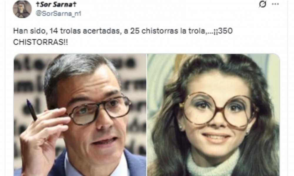 Sociedad Memes. 'Un, dos, tres'... ¡Sánchez! Ahora sí que te veo. Redacción 31/10/25 13:08 'Un, dos, tres'... ¡Sánchez! Maravilla esto de @firmestel 🤣🤣👌 pic.twitter.com/4h9TPXrYzP— Dios (@diostuitero) October 31, 2025 Etiquetas: Memes Opinión Enormes minucias por Eulogio López El ministro de la Verdad, Urtasun también pide perdón por Hernán Cortes... Eulogio López Esclavicemos al jabalí. ¿Puede pasar de animal salvaje a animal doméstico? Sí, pues adelante con ello Eulogio López Sánchez pide perdón a Puigdemont: necesita sus siete votos Eulogio López Argumentos Vito Quiles pregunta a Puente, por Koldo y Ábalos, presos en Soto del Real... y el ministro de Transportes sale huyendo "más rápido que sus trenes" Hispanidad La Fiscalía de Sevilla archiva la denuncia de Amama por el supuesto borrado de mamografías. ¿Pedirá perdón RTVE? Hispanidad El dúo Pili-Félix: compiten en un tik tok, por ver quién de los dos es menos soso Hispanidad Al cierre del Mercado 2024, un año para olvidar, tanto en Tubacex como en Tubos Reunidos por Ana Sánchez Arjona Artículos anteriores Entrevistas “Europa lleva mucho tiempo poniendo aranceles y cortapisas a productos y compañías americanas (y europeas)” por Ana Sánchez Arjona Artículos anteriores La Casa Blanca Un afgano al que la Administración Biden-Harris le concedió el visado de refugiado tirotea a dos agentes de la Guardia Nacional, cerca de la Casa Blanca por Ignacio Aguirre Artículos anteriores Cartas al director La cándida inocencia de Drope "Una sola carne" Sociedad 'Crowdfunding'. Piden fondos para culminar las obras de la nueva parroquia de San Francisco de Sales, en Parla Este (Madrid) por Redacción Artículos anteriores La sorprendente historia de Sor Patrocinio "Las llagas de la monja eran ciertas" Minucias visuales Paracuellos del Jarama, catedral de los mártires La Resistencia por Javier Paredes Artículos anteriores Fuego Poeta pasmado por J. R. Pablos Artículos anteriores El Reinado Eucarístico Se iniciará una guerra de todos contra todos. Nadie sabe, ni Yo mismo, cómo terminará la historia. El hombre no se salva por las profecías, sino por la conversión... Lo más leído Caza de brujas en Telefónica El Santander tiene un problema con Juan Carlos Barrabés La necedad crece en la Unión Europea. ¡Oh, progre Navidad! Bruselas instala un belén sin rostros para "no excluir a nadie" Memes. Salazar, el feminista