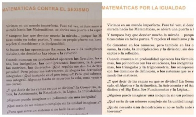 La cuestión es que la modificación se ha realizado en un apartado que en un principio se titulaba «Matemáticas contra el sexismo» y después del cambio ha pasado a llamarse «Matemáticas por la Igualdad».