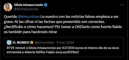 El pasado mes de marzo, El Mundo publicaba unas informaciones sobre el salario y el contrado de Silvia Intxaurrondo en RTVE: «RTVE renovó a Silvia Intxaurrondo por 537.000 euros el mismo día de su dura entrevista a Alberto Núñez Feijóo». Entonces, Intxaurrondo, una de las periodistas de cámara del Sanchismo, demandó a Joaquín Manso, director de El Mundo y Unidad Editorial.