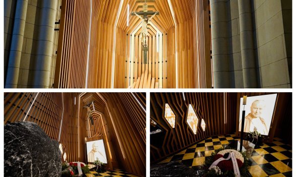 Según el propio obispado, la nueva capilla de la Almudena dedicada al Papa Wojtyla, toda ella biselada en madera se inspira en el amor por los bosques del pontífice polaco.