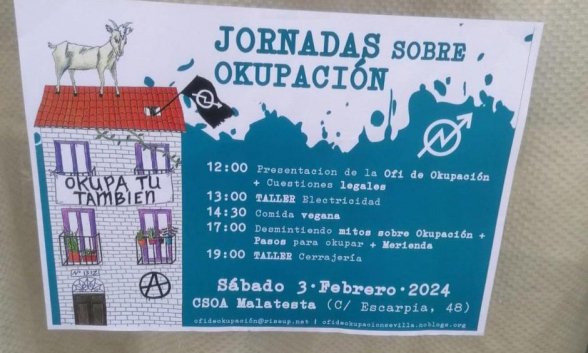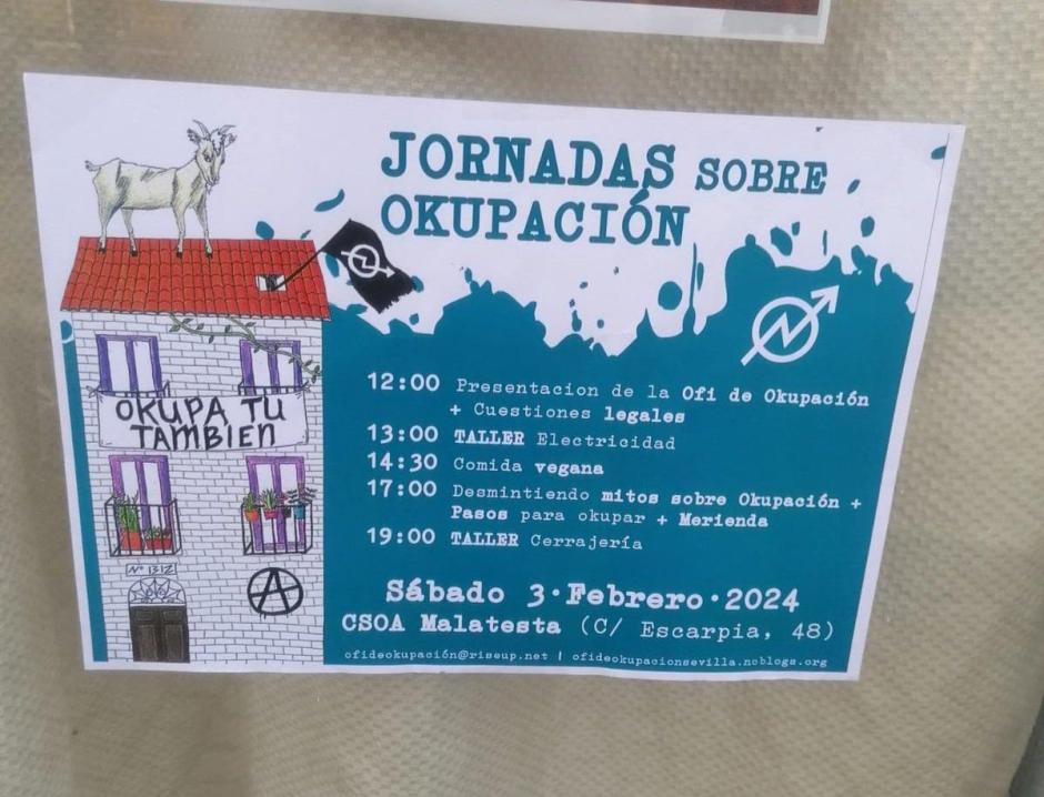 Estas oficinas se reparten por todo el territorio nacional y la última ciudad a la que han llegado es Sevilla. Es más, se ha hecho viral un cartel de unas jornadas sobre okupación en la capital andaluza. El programa incluía talleres de electricidad y cerrajería, charla sobre los "mitos" de la okupación e instrucciones del paso a paso para convertirse en okupa. Y ojo, porque los asistentes podían disfrutar de una comida vegana.