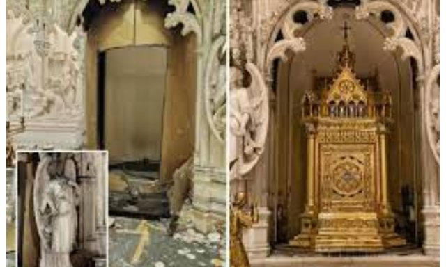 Los ladrones también cortaron las cabezas de las estatuas de ángeles que la flanqueaban y dejaron la Eucaristía esparcida por el altar