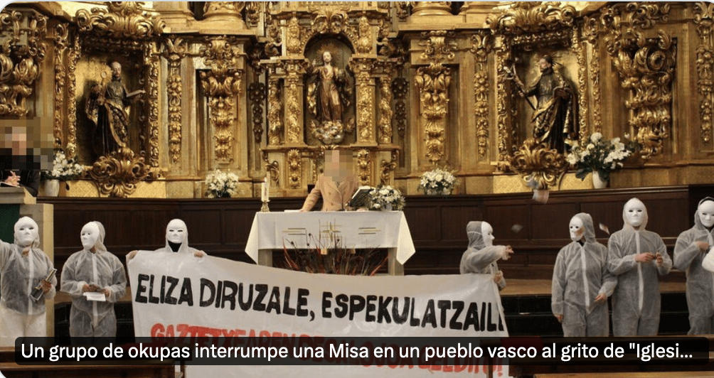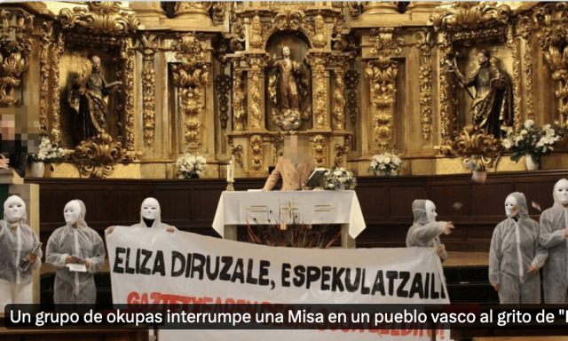 Y el último episodio de ese acoso tuvo lugar el pasado domingo 21 de enero, cuando siete individuos con los rostros tapados irrumpieron en la misa dominical en la iglesia de Zestoa, con pancartas con lemas totalmente agresivos contra la iglesia, como avariciosa (“diruzale”) y especuladora (“espekulatzaile”) y tirando dinero falso a lo largo del templo.