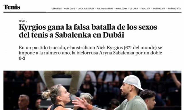 Pues El País escribe su crónica y la titula: "Kyrgios gana la falsa batalla de los sexos del tenis a Sabalenka en Dubái". Y comienza: "de imponente altura, magnífico saque, toque de seda, precario estado físico e indolencia, juega a golpes de capricho. Acelera y arrolla, lifta y saca de la pista al rival, pero se asusta por la facilidad con la que gana los puntos y levanta el pie, reduce la velocidad del saque y envía bolas al otro lado de la red como haría un entrenador para que el jugador de enfrente ensaye los golpes más difíciles. El juego se iguala, y el marcador, y parece que hay partido. Enfrente no tiene a un jugador, sino a una". Vaya, El País deja entrever que el jugador se deja ganar algún punto porque compite contra una mujer, y claro, eso es una desigualdad de condiciones.