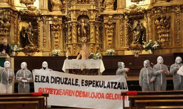Siete personas con los rostros ocultos tras caretas blancas, vestidos con buzos blancos, entraron el pasado domingo en la parroquia de Zestoa, en plena misa. Cuando se encontraban en el altar desplegaron una pancarta en la que se acusaban a la Iglesia de avariciosa (“diruzale”) y especuladora (“espekulatzaile”).