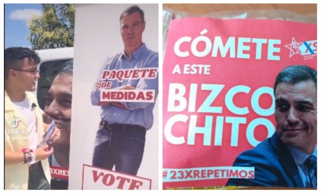 Ya lo ven, marketing innovador: pegar la cara del presidente del Gobierno en envoltorios de bollos rellenos con el lema «Cómete este bizcochito». Además, merchandising que consistía en un calendario con la cara de un perro con traje y la frase «más sabe perro sanxe por perro que por sanxe», y envoltorios de bollos con la cara del presidente y el lema antes mencionado. Además entregaron a los más jóvenes un preservativo en el que también se muestra una imagen de Sánchez con un plátano en la mano acompañado del texto «comas lo que comas el 23J vota seguro».