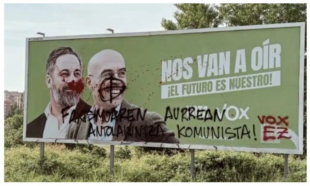 «Así ha amanecido nuestra valla publicitaria en La Chantrea vandalizado por los cachorros de ETA. En menos de 24 horas de campaña llevamos dos ataques o amenazas a VOX en Navarra. ¡Seguimos! #NosVanAOír», ha comentado Vox en la red social X (antes Twitter).