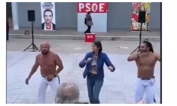 Mitin multicultural en el Auditorio al aire libre Cerro Almodóvar de Madrid. La exministra de Industria, Comercio y Turismo, Reyes Maroto, se animó a bailar -o así que dijo un vasco- junto a dos bailarines descamisados. Y este fue el resultado:
