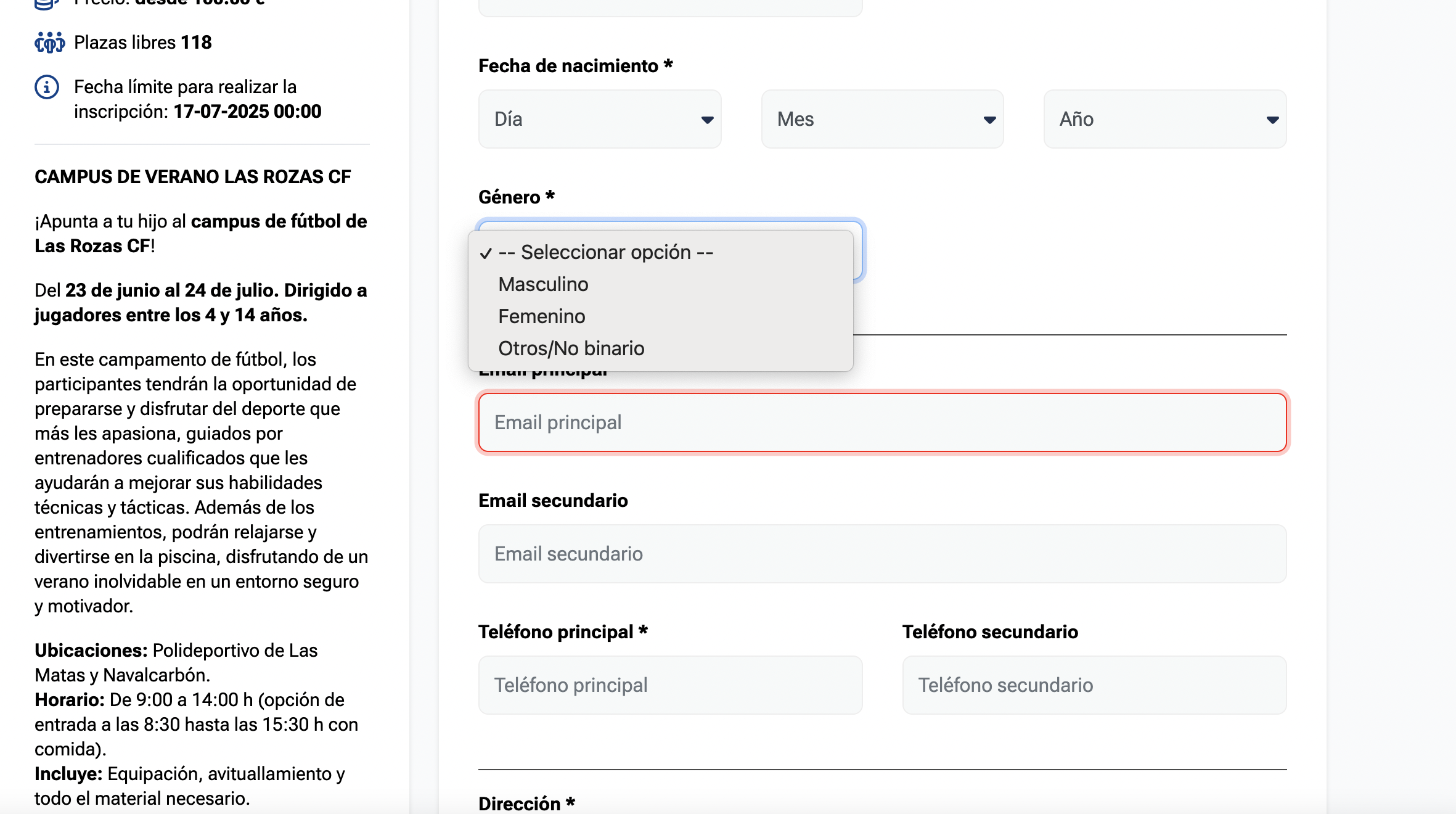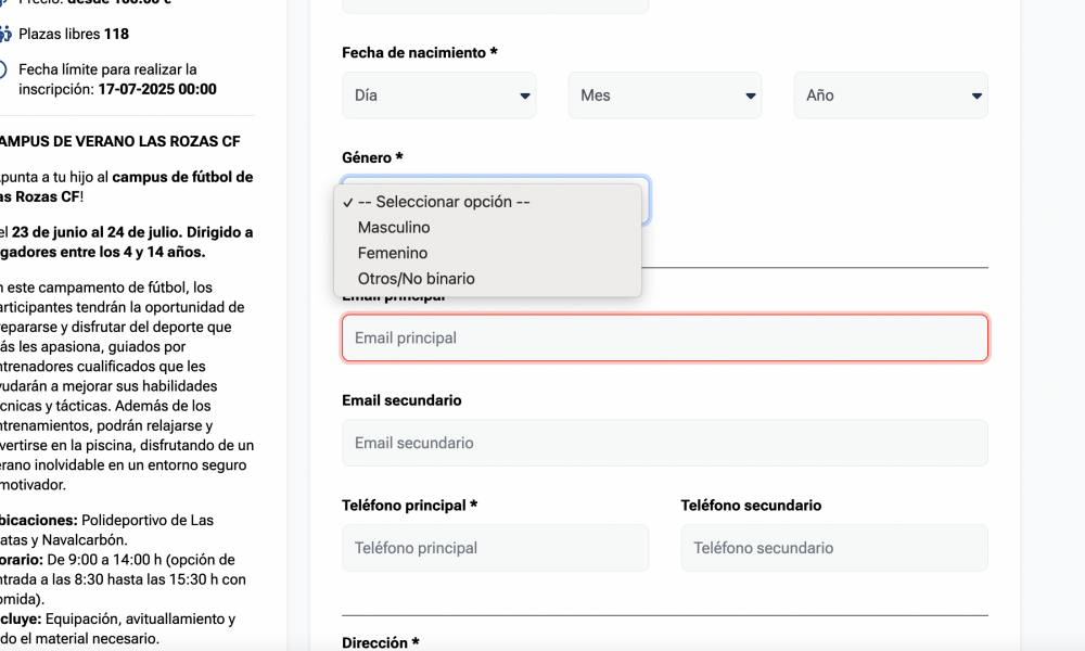 Hasta aquí, todo correcto y una gran idea para que, en las semanas de verano, los niños puedan realizar ejercicio. El 'pequeño' problema llega cuando a la hora de la inscripción hay que seleccionar el género del menor, donde puedes escoger entre masculino, femenino... y no binario.