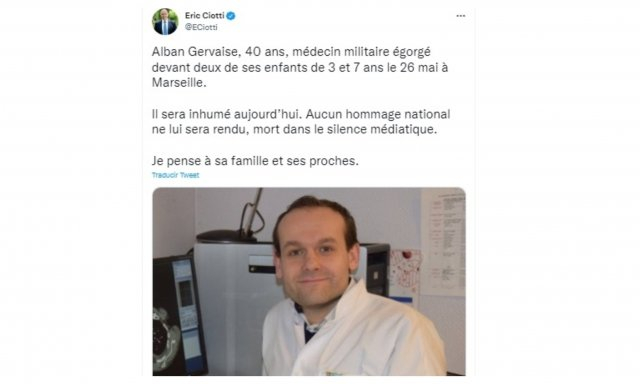 En Twitter, el diputado (LR) de los Alpes Marítimos Eric Ciotti por su parte expresó su «fuerte emoción» al enterarse del asesinato. El diputado abogó por «que se mantenga el móvil terrorista en este caso».