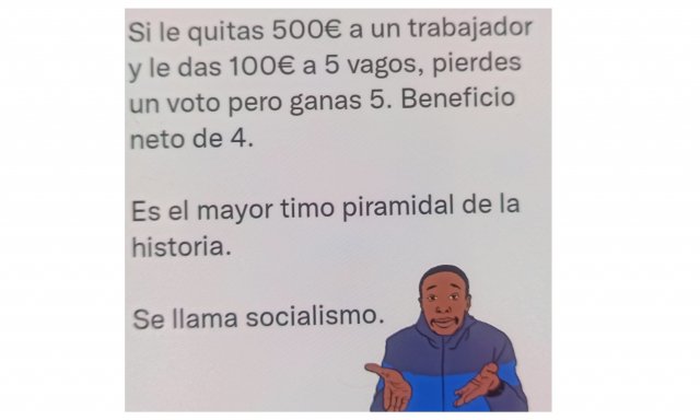 Sociedad Memes. El socialismo, explicado La selección de Podemos. Redacción 09/10/21 09:00 El socialismo, explicado Etiquetas: Memes Opinión Enormes minucias por Eulogio López Alcalde Almeida, presidenta Ayuso: no todo puede ser publicidad Eulogio López Hacienda recauda cada vez más, pero los servicios públicos son cada vez peores: esto marcha Pablo Ferrer El buen gestor no es el que reduce gastos sino el que aumenta ingresos Eulogio López Argumentos ¡Feliz Navidad!, valientes “¡Qué te los lleves a tu casa! No es racismo, primero estamos los españoles, que esta gente viene sin papeles”: una vecina de Badalona, al podemita Pablo Fernández Hispanidad Irene venía "llorada de casa", pero ya no: Alvise le dice que ha "ascendido políticamente, hasta casándote con tu exjefe de partido"... y a la eurodiputada podemita se le saltan las lágrimas Hispanidad Al cierre del Mercado 2024, un año para olvidar, tanto en Tubacex como en Tubos Reunidos por Ana Sánchez Arjona Artículos anteriores Entrevistas “Europa lleva mucho tiempo poniendo aranceles y cortapisas a productos y compañías americanas (y europeas)” por Ana Sánchez Arjona Artículos anteriores La Casa Blanca Nueva campaña de calumnias contra Trump: Vanity Fair manipula una entrevista a su jefa de gabinete, Susie Wiles por Ignacio Aguirre Artículos anteriores Cartas al director Extremadura y la dura extrema realidad El Gobierno de España no sólo profana sino que también perpetra ilegalidades con el Valle de los Caídos Sociedad 'Crowdfunding'. Piden fondos para culminar las obras de la nueva parroquia de San Francisco de Sales, en Parla Este (Madrid) por Redacción Artículos anteriores La sorprendente historia de Sor Patrocinio "Las llagas de la monja eran ciertas" Minucias visuales Almería. Pozos de La Lagarta y Cantavieja, donde los republicanos asesinaron a 152 personas. Suma y sigue... La Resistencia por Javier Paredes Artículos anteriores Fuego Poeta pasmado por J. R. Pablos Artículos anteriores El Reinado Eucarístico La clave consiste en consagrarse a María. A más almas consagradas a la Virgen María, menor castigo. Pero la consagración debe ser sincera y total: "Todo tuyo soy, María". Lo más leído La Noche Buena de 1936 en la cárcel de Porlier, en Madrid Católicos amodorraditos. La Sexta utiliza a Cristina López Schlichting La historia del burro Alcalde Almeida, presidenta Ayuso: no todo puede ser publicidad