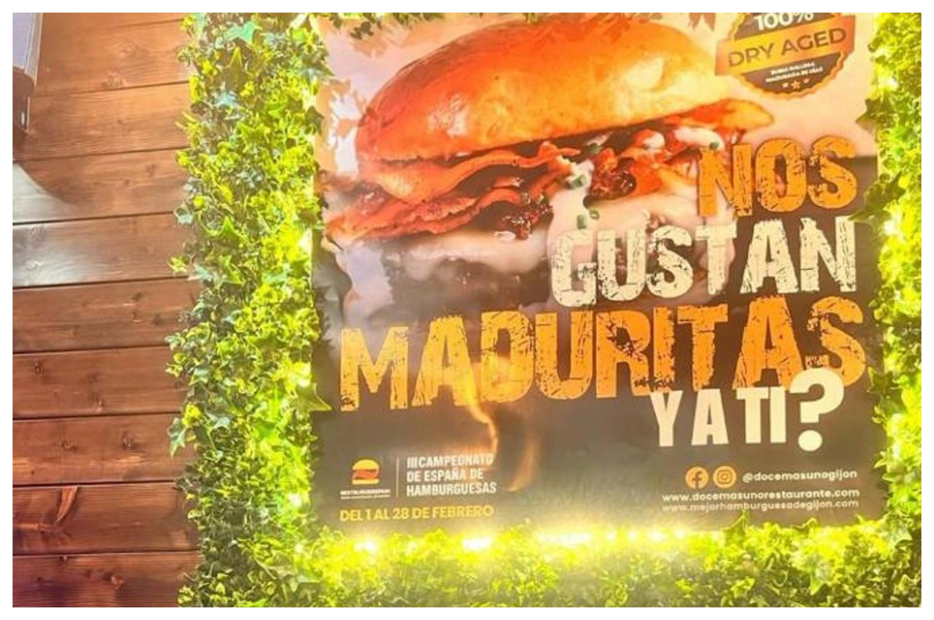 Tal como recoge Cope, la propietaria del negocio, Doce más Uno, que compite en el Campeonato de España de Hamburguesas, denuncia que han retirado su publicidad sin pre-aviso y que la única alternativa que le dan es: o cambiar el lema o rescindir el contrato, que se prolongaba hasta el año que viene.