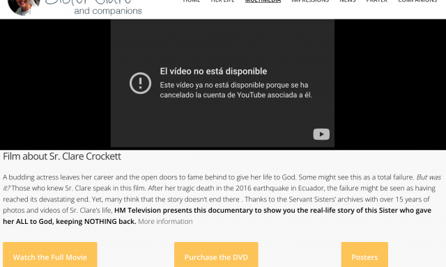 El vídeo que más nos ha dolido perder es la versión en inglés del documental «O todo o nada: Hna. Clare Crockett» sobre el que se pueden leer los subtítulos en croata, chino, armenio, eslovaco, indonesio y húngaro, con sus muchos comentarios y visualizaciones. Cada día recibimos testimonios, tanto por escrito como de palabra, del gran bien espiritual que está haciendo este documental: muchas conversiones; jóvenes que descubren o aceptan su vocación a la vida consagrada o al sacerdocio; vocaciones «salvadas en un momento de crisis; gracias recibidas… muchas vidas cambiadas por el testimonio de conversión y entrega a Dios de la Hna. Clare. De todo esto pueden ver una pequeña muestra en la sección «Nos escriben» de la web www.hermanaclare.com